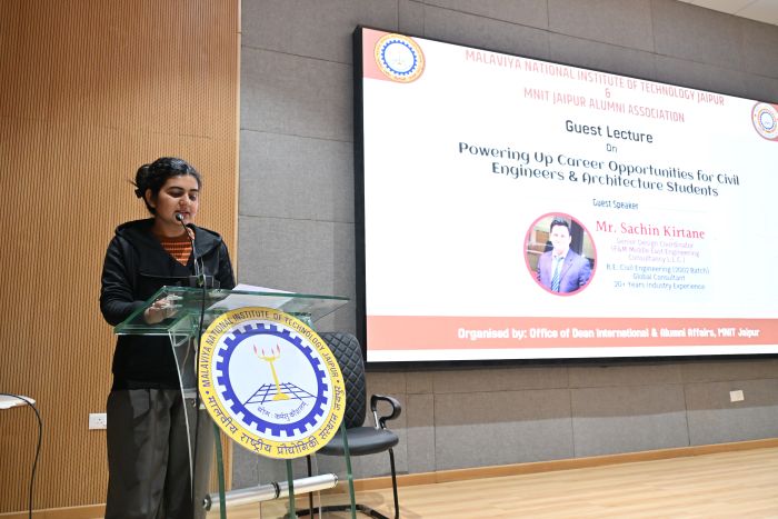 MNIT Jaipur successfully organized an Alumni Guest Lecture on “Powering up Career Opportunities for Civil Engineers and Arch. Students” on 8 January 2026, at MNIT. The event commenced with a warm welcome and felicitation of Mr. Sachin Kirtane and his spouse with a sapling and safa, followed by an address by Dr. Pawan Kalla (AD, Alumni Affairs). The session then progressed with an insightful talk by Mr. Sachin Kirtane, an esteemed alumnus of the B.E. Civil Eng 2002 batch. Drawing upon his extensive professional experience, Mr. Kirtane shared practical perspectives on design & project management, highways and roads engineering, helping students gain a clear understanding of industry expectations and real-world engineering practices. The program concluded with a vote of thanks by Dr. Pawan Kalla, and felicitated Mr. Kirtane with the Institute souvenir as a mark of appreciation, followed by a group photograph and refreshments. The lecture was highly informative and inspired students to develop career-ready skills for the evolving engineering industry.